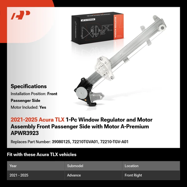 2021-2025 Acura TLX 1-Pc Window Regulator and Motor Assembly Front Passenger Side with Motor A-Premium APWR3923